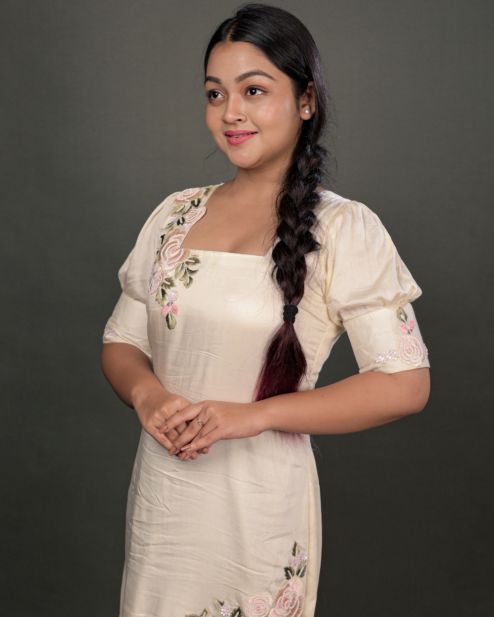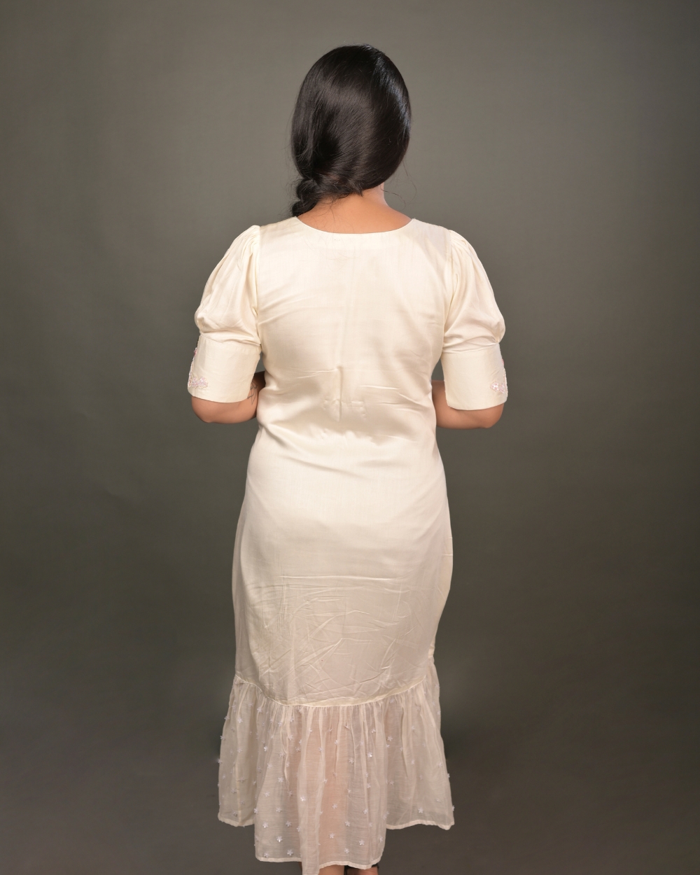 A graceful off-white indo-western one-piece featuring delicate floral embroidery and a stylish flared hem. Perfect for festive occasions, family gatherings, or elegant day-out looks.